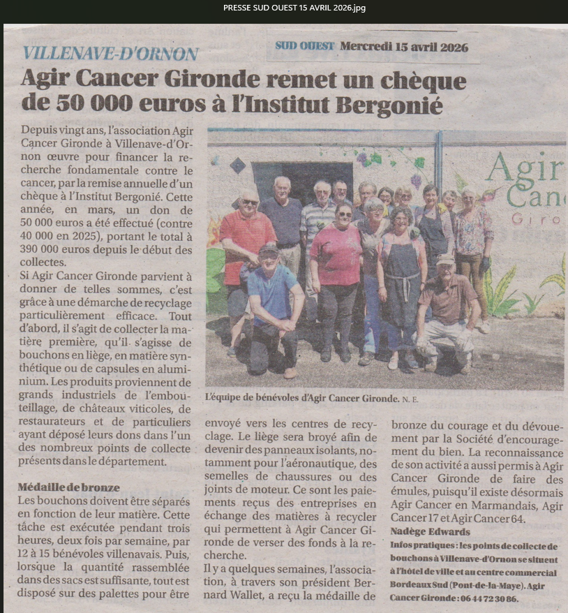 Agir Cancer Gironde remet un chèque de 50 000 euros à l’Institut Bergonié